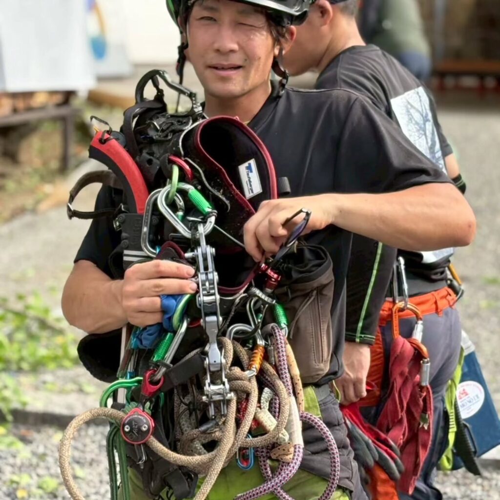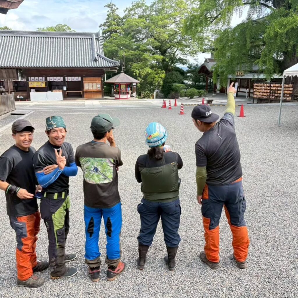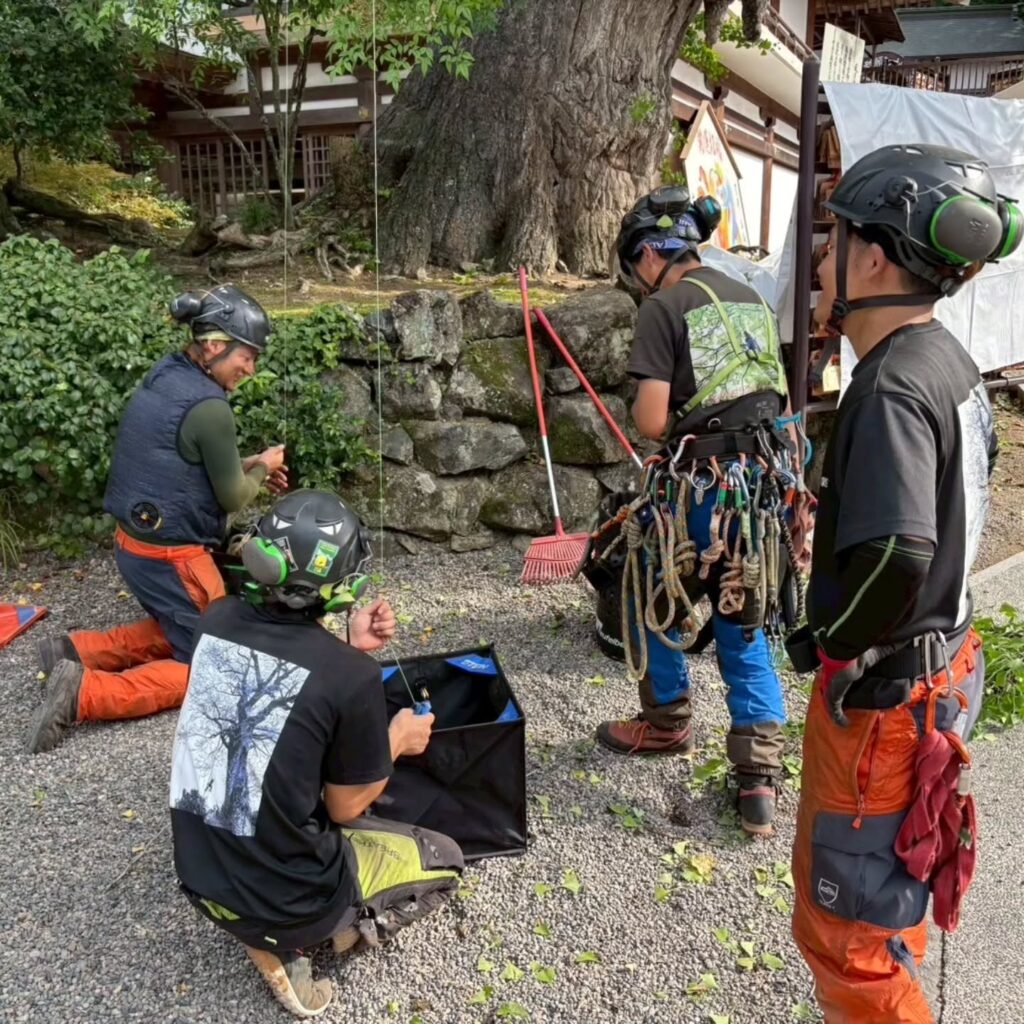 かわうち林業では、林業の専門技術を活かしながら、御神木や周囲の樹木がこれからも健やかに育つよう、状態を丁寧に確認しつつ作業を進めています。