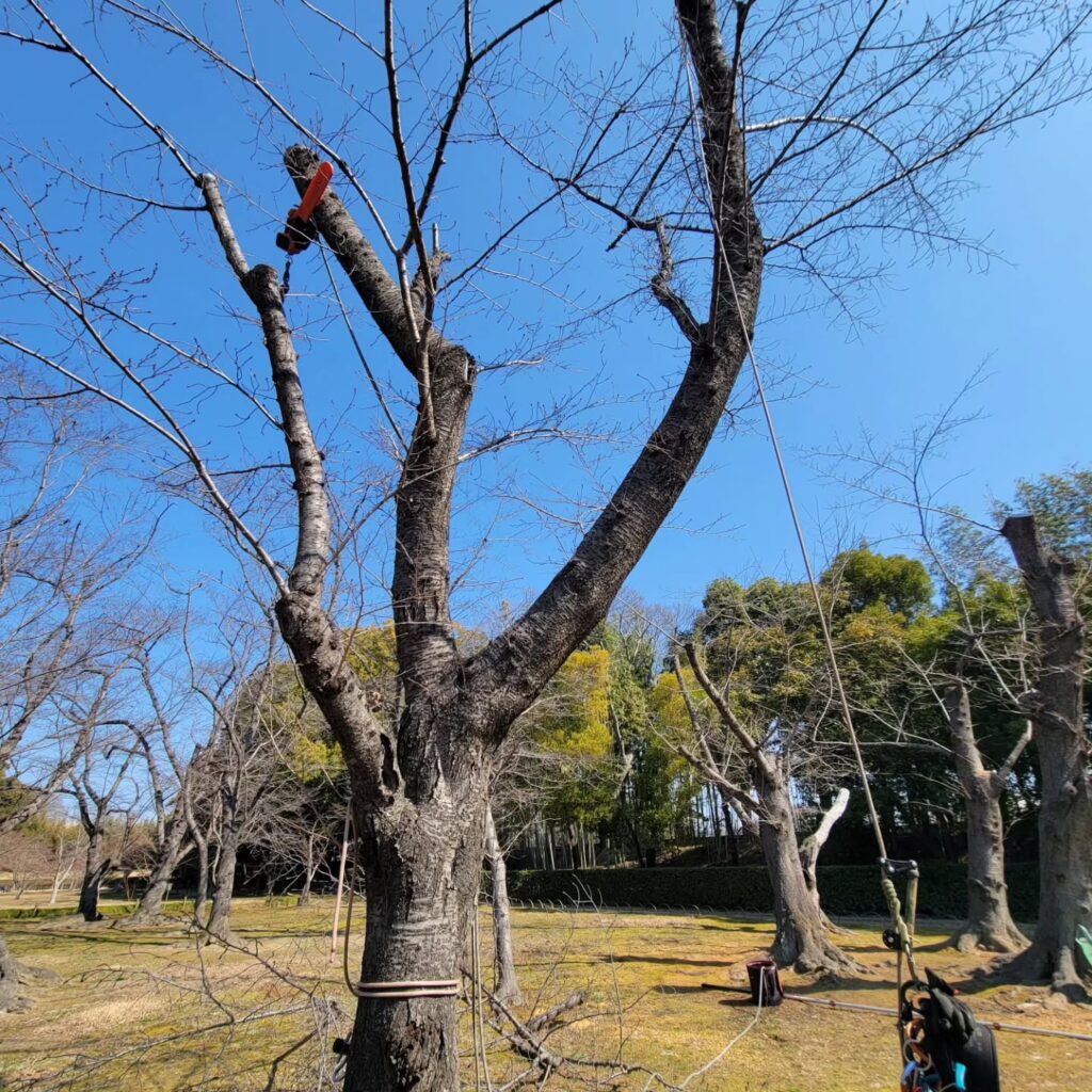 今回で2回目の作業となりますが、園内の桜は老齢木も多く、一本一本の状態を確認しながら、安全面と景観のバランスを意識した林業作業を実施しました。