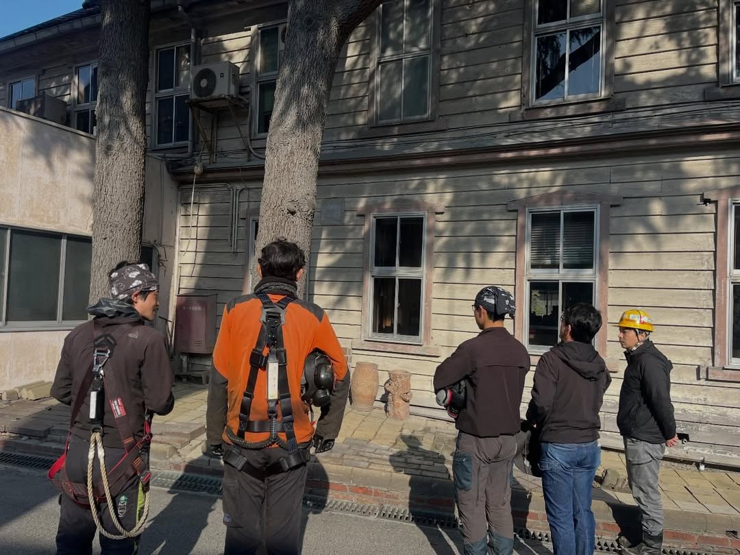 今回はクレーンを使用した伐採作業となり、高い木ならではのリスクに配慮しながら、安全かつ確実に作業を進めました。周囲の環境にも十分注意を払い、一本ずつ慎重に吊り下ろしていきます。